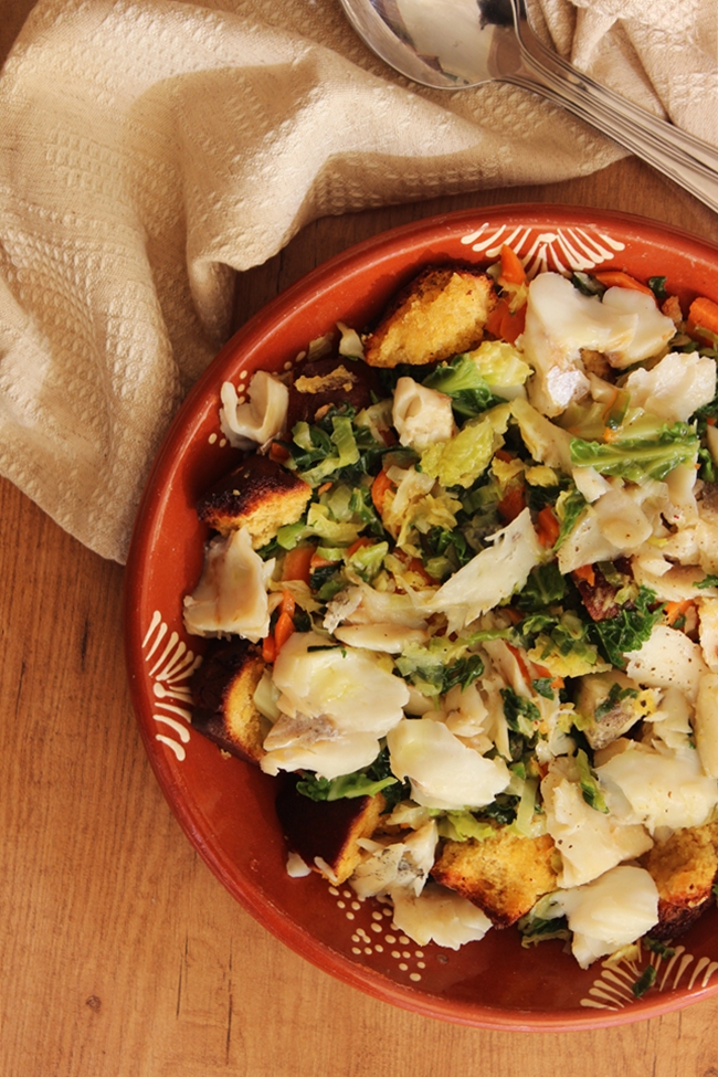 Um prato típico português que adoro. Feito com três ingredientes que nunca podem faltar nesta cozinha: pão, azeite e alhos. Juntam-se à festa o bacalhau e as couves e a tiborna está feita. É um petisco bastante recorrente por estes lados.