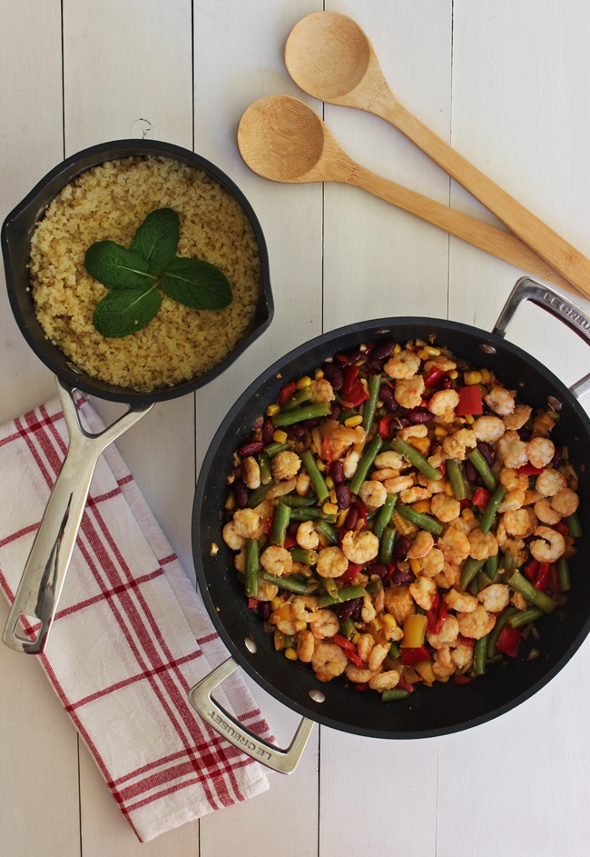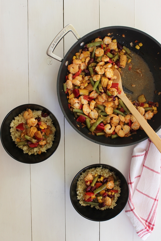Salteado de Legumes Mexicanos, Camarão e Bulgur