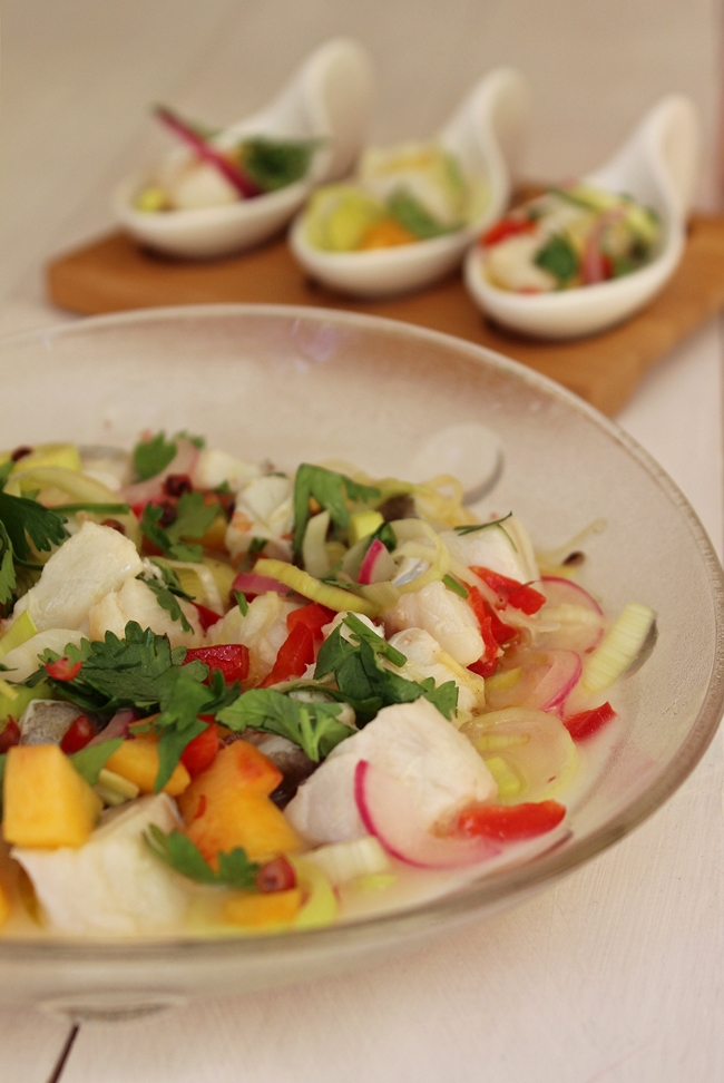 Os dias quentes convidam a pratos leves e frescos, hoje falo-vos de um ceviche que serviu de entrada, a um dos jantares cá de casa, nos útimos dias.