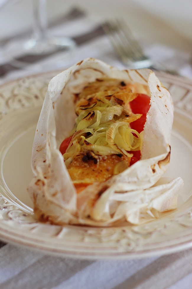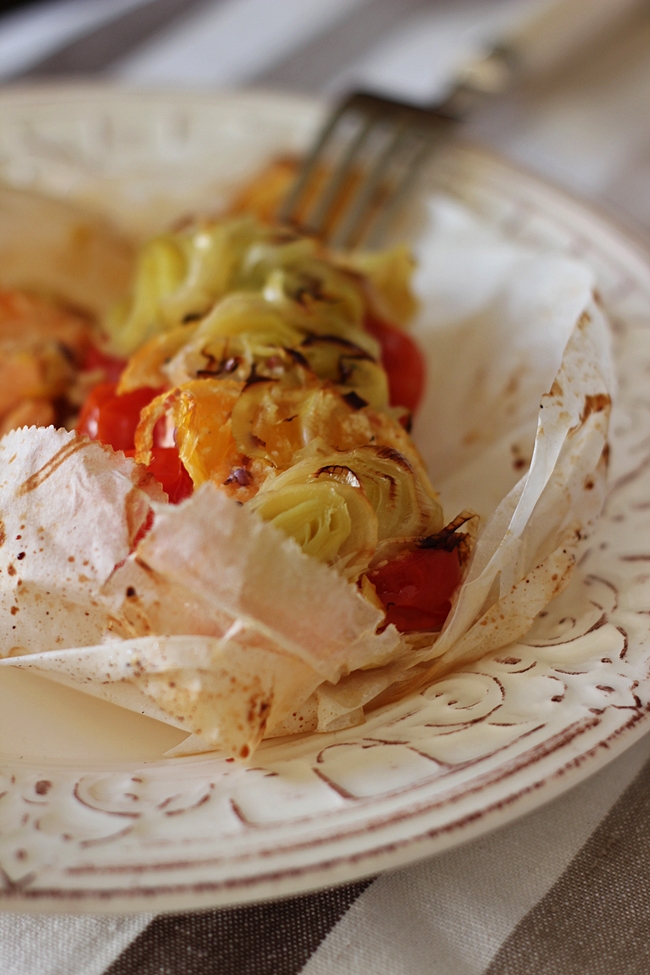 O prato de hoje foi cozinhado no forno em papelotes. É uma forma muito prática e eficaz quando pretendemos que os sabores fiquem concentrados no que cozinhamos. Fiz uma marinada prévia onde deixei o salmão cerca de 30 minutos, depois foi só juntar mais uns quantos ingredientes, neste caso alho-francês, tomate-cereja e um fio de azeite. Embrulhar em papel vegetal e levar ao forno pré-aquecido cerca de 25 minutos. Em pouco tempo temos uma refeição prática, saudável e saborosa.